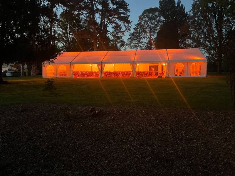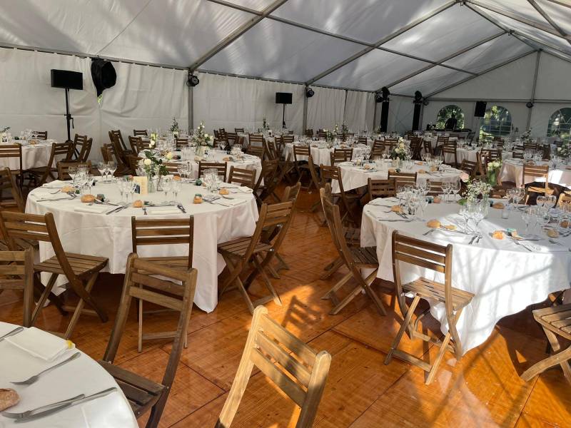 À Saint-André-le-Bouchoux, nous avons eu le plaisir d’installer un chapiteau de 10 x 25 mètres équipé d’un plancher flottant et d’un chauffage à air pulsé au fuel, garantissant le confort des invités tout au long de la soirée.